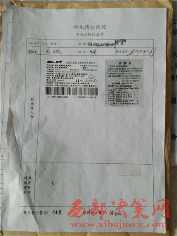 患者家屬將原來在博仁醫(yī)院住院的資料全部拿出來時發(fā)現,大保當博仁醫(yī)院當時給患者做手術所用的鋼板可能存在問題,做手術所用的鋼板與當時給患者提供的合格證書不符,在此期間家屬也找過原博仁醫(yī)院劉院長,所給的答復是他剛來不知道此事,董事長(賀玉剛)也說是在西安,你們先看病,回頭把鋼板拿過來,等鋼板廠家的人來了,我們三方坐在一起看怎么解決,就這樣一直拖著直到現在。