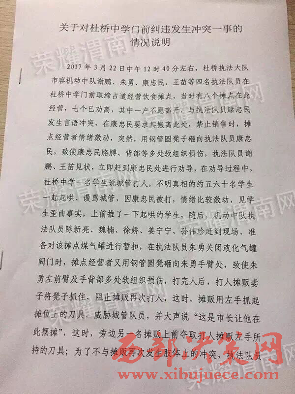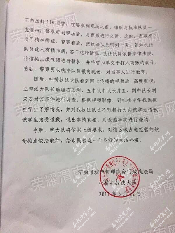 當(dāng)晚6點(diǎn)以后,涉事執(zhí)法隊(duì)員所屬執(zhí)法大隊(duì)杜橋執(zhí)法大隊(duì)書(shū)面回復(fù)便在網(wǎng)絡(luò)中被網(wǎng)友們不斷的轉(zhuǎn)載。據(jù)該回復(fù)稱:2017年3月22日中午12時(shí)40分左右,杜橋執(zhí)法大隊(duì)市容機(jī)動(dòng)中隊(duì)謝鵬、朱勇、康忠民、王苗等4名執(zhí)法隊(duì)員在杜橋中學(xué)門前取締占道經(jīng)營(yíng)飲食攤點(diǎn),當(dāng)時(shí)有八個(gè)攤點(diǎn)在此經(jīng)營(yíng),七個(gè)已勸離,其中一戶不愿離開(kāi),與執(zhí)法隊(duì)員康忠民發(fā)生言語(yǔ)沖突,在康忠民要求其搬離此處,禁止銷售時(shí),攤點(diǎn)經(jīng)營(yíng)者情緒激動(dòng),突然,用鋼管圓凳子砸向執(zhí)法隊(duì)員康忠民,致使康忠民胳膊、背部等多處軟組織損傷,執(zhí)法隊(duì)員謝鵬、王苗等見(jiàn)狀,立即趕到康忠民處進(jìn)行勸導(dǎo),在勸導(dǎo)過(guò)程中,杜橋中學(xué)一名學(xué)生說(shuō)城管打人,不明真相的約五六十名學(xué)生一起起哄、謾罵城管,因康忠民被打,情緒比較激動(dòng),見(jiàn)學(xué)生歪曲事實(shí),上前推了一下起哄的學(xué)生,隨后,機(jī)動(dòng)中隊(duì)執(zhí)法隊(duì)員朱勇、陳新亮、魏楠、徐嬌、姜寧寧、孫偉珍趕到現(xiàn)場(chǎng),準(zhǔn)備對(duì)該攤點(diǎn)煤氣罐進(jìn)行暫扣,在執(zhí)法隊(duì)員朱勇關(guān)閉液化氣罐閥門時(shí),攤點(diǎn)經(jīng)營(yíng)者用鋼管圓凳砸向朱勇手臂處,致使朱勇左前臂及手背部多處軟組織損傷,打完人后,打人攤販妻子將凳子抓住,阻止攤販再次打人,這時(shí),攤販用左手抓起攤位上的刀具,威脅城管隊(duì)員,并大聲說(shuō)“這是市長(zhǎng)讓他在此擺攤”,這時(shí),旁邊另一名攤販上前奪取打人攤販左手所持的刀具;為了不與攤販再次發(fā)生肢體上的沖突,執(zhí)法隊(duì)員王苗撥打110報(bào)警,在警察到現(xiàn)場(chǎng)之前,攤販與執(zhí)法隊(duì)員一直僵持;警察趕到現(xiàn)場(chǎng)后,與商販進(jìn)行交涉,這時(shí),商販亮出了精神病證,警察看后,把執(zhí)法隊(duì)員叫到一旁,告知執(zhí)法隊(duì)員此人有精神??;鑒于這種情況,執(zhí)法隊(duì)員依據(jù)法律法規(guī),將該攤點(diǎn)煤氣罐進(jìn)行暫扣,并將暫扣單交于打人商販的妻子,隨后,警察要求執(zhí)法隊(duì)員撤離現(xiàn)場(chǎng),對(duì)當(dāng)事人進(jìn)行教育。