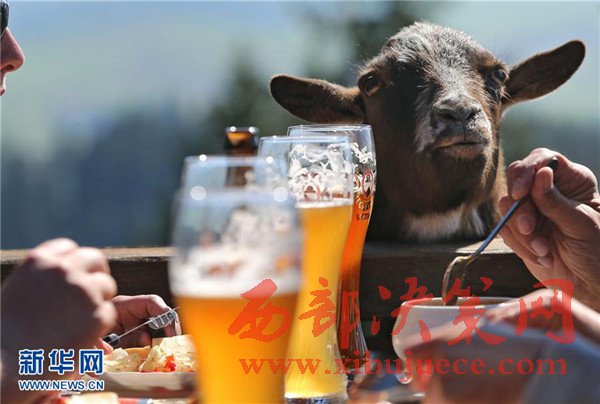 3月27日,在德國南部塞格附近的一家戶外餐館,一只山羊向正在用餐的客人討要食物。