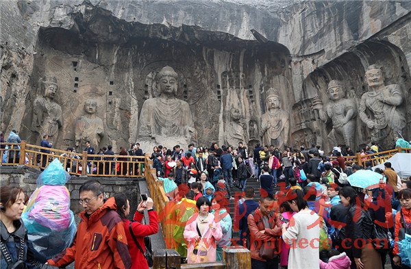 4月4日,游客冒雨游覽河南洛陽(yáng)龍門(mén)石窟。