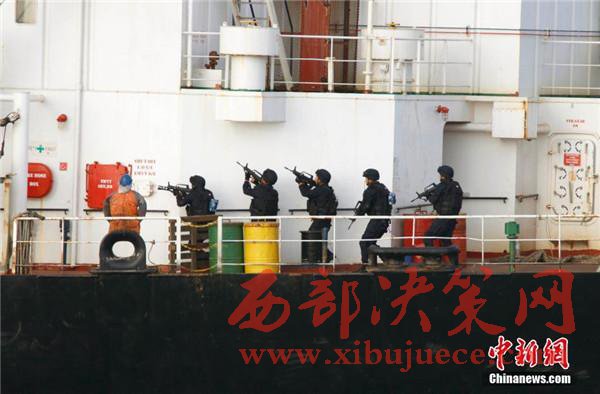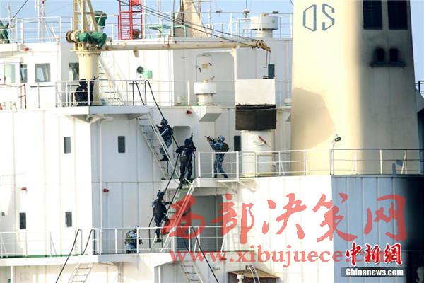 圖為特戰(zhàn)隊(duì)員快速登入商船展開營救活動。