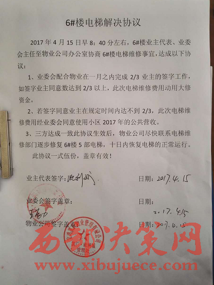 最新進展:4月15日,業(yè)主委員會和凱躍物業(yè)達成維修協(xié)議,業(yè)委會配合物業(yè)在一月之內(nèi)完成2/3 業(yè)主的簽字工作,電梯維修費使用大修資金。如果在規(guī)定時間內(nèi)達不到2/3業(yè)主簽字,則使用小區(qū)2017年的公共營收。三方協(xié)議達成后,由凱躍物業(yè)盡快聯(lián)系電梯維修公司,十日內(nèi)恢復電梯的正常運行。