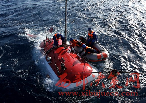 5月10日,“蛙人”系纜,“蛟龍”號完成下潛準(zhǔn)備回到船上甲板。