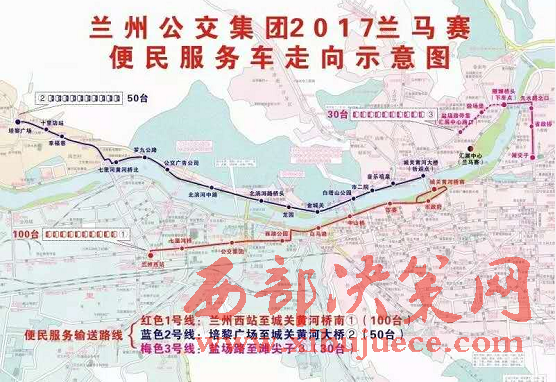 2號(hào)接送專線:賽事當(dāng)天早4:40時(shí)開始至6:30結(jié)束(路橋封閉之前),由培黎廣場(chǎng)始發(fā),不間斷開往北濱河路城關(guān)黃河大橋,途經(jīng):十里店、幸福巷、七里河黃河橋北、羅九公路、公交廣告、北濱河中路、龍?jiān)?、金城關(guān)、白塔山公園、市二院、音樂噴泉、城關(guān)黃河大橋(折返),該線路配車50臺(tái)。