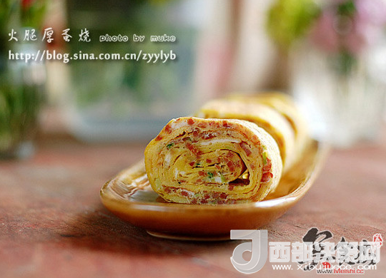 7.重復(fù)第6步驟,直到蛋液全部用完(每次倒蛋液的時(shí)候,都攪拌一下,不要讓火腿末等沉在碗底,鍋?zhàn)硬徽承Ч玫脑?,只需要開始時(shí)抹一次油即可,覺得粘的話,中途也可以抹油)。