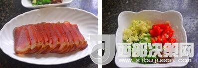 原料:臘肉、朝天椒、花椒、蒜末、香菜。