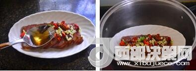 5、蒸鍋注水燒開,放入臘肉,蒸制20分鐘至臘肉酥軟。