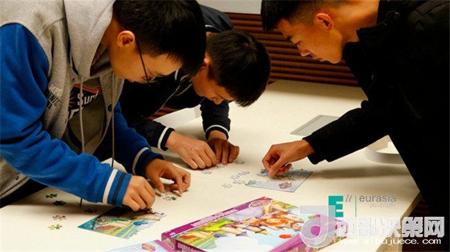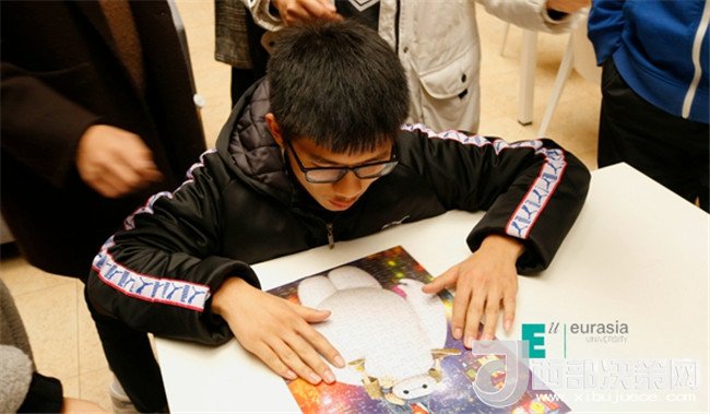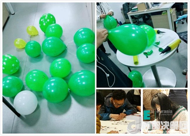 土豆和西紅柿根本就不是一個世界的,但它們走到了一起,變成了薯條和番茄醬它倆就是絕配;學(xué)籍制度和競技運動也不是一個世界的,但它們?nèi)诤显诹艘黄?,變成了頭腦風(fēng)暴和趣味運動它們也可以很般配,現(xiàn)在就讓我們來看看它們是怎么融合的……聽那陣陣氣球爆炸的聲音,他們開始了!在這些綠油油的氣球中有事先設(shè)置的題目隊員們要先擠爆氣球答完題才能得到下一個地方的線索,“補考成績不合格以及成績低于50分必須怎樣?”“本科選修課學(xué)分不得低于多少學(xué)分?”這些題是不是還要開動腦袋瓜仔仔細細的想想才有答案呢?在比賽的現(xiàn)場一秒都會和對手拉開差距,容不得一絲猶豫拿到線索的隊員們又奔向下一個地點熟悉的教室,這里也不是那么容易通過,看著黑板上的題“冰怎么很快的化成水?”“可替代大學(xué)英語四級成績的考試有哪些?”哦,還有計算題,隊員們必須腦洞大開,腦細胞飛速運轉(zhuǎn),做學(xué)霸那也是不容易的。只見黑板上粉筆一起一落,答題完畢,看看線索迅速趕往下一地點——地中海。這里指壓板、跳繩早已準(zhǔn)備好等著隊員們,學(xué)霸不能只管學(xué)習(xí)身體素質(zhì)也很重要,動起來吧!在指壓板上跳繩,誰想出來的?忍受著腳底的疼痛還要揮動跳繩?太受虐,但是我們是一群不屈不撓的新一代,指壓板上跳繩我們也是鏗鏘有力、一絲不茍。終于結(jié)束痛并快樂著的跳繩環(huán)節(jié),卻看到了整整400塊的拼圖,這個環(huán)節(jié)真是讓人又愛又恨,還記得兒時玩拼圖的快樂,但在這激烈的競爭環(huán)境下,卻是讓人有點心慌和畏懼。隊員們最終齊心協(xié)力戰(zhàn)勝了它,細心、耐心的逐一完好的拼完了每一副圖。
