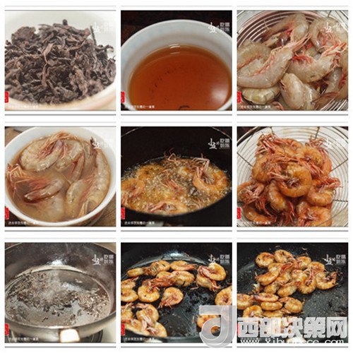 準備好烏龍茶;加入開水沖泡,第一泡茶水倒掉,其他的茶水沖在碗里,茶葉瀝干水分待用;海蝦去除蝦頭,蝦背剪開;將蝦放入茶水中,浸泡1個小時,撈出瀝干水分;熱油,下蝦,用中火炸至蝦金黃;取出,再快速復炸一遍,瀝干油;取一平底鍋,下1湯匙左右的油,溫度足夠時,下茶葉,用中小火炒出茶葉的香味;下蝦,繼續(xù)用中小火炒均勻,炒至蝦變熱;加入椒鹽粉調(diào)味,即可熄火。