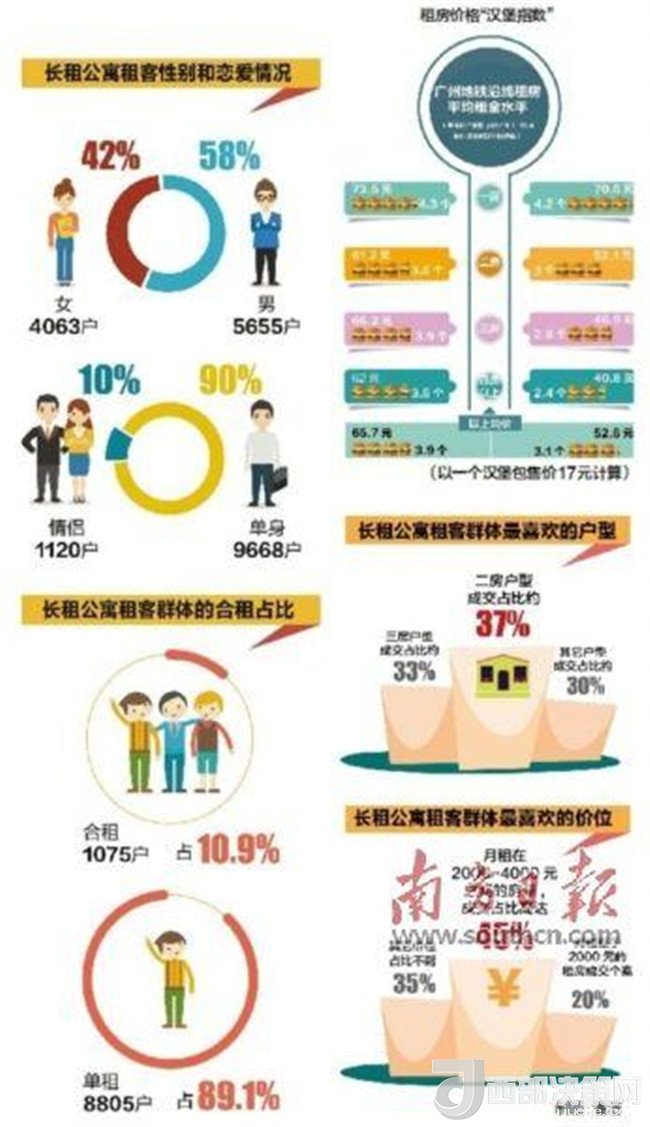 那么,對(duì)廣州這座全國主要的一線城市來說,目前的住房租賃市場(chǎng)和租房的情況與其他城市有何不同呢?最近,南方日?qǐng)?bào)、南方+聯(lián)合萬科泊寓、廣州中原地產(chǎn)等企業(yè)機(jī)構(gòu),在“租房時(shí)代”南方號(hào)向廣大網(wǎng)友和住房租賃行業(yè)人士推出了“廣州地鐵沿線住房平均租金漢堡指數(shù)”、“長(zhǎng)租公寓租房群體畫像”等系列大數(shù)據(jù)分析產(chǎn)品。