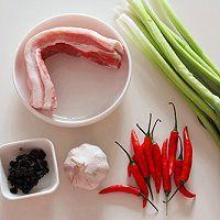 主料:五花肉一塊、青蒜苗一把、小紅辣椒適量、蒜適量、豆豉適量。
