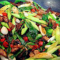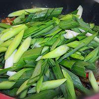 7. 將青蒜苗放進(jìn)鍋中,大火煸炒勻均。