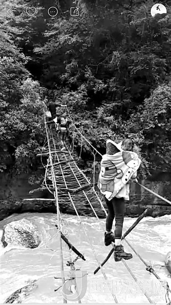 現(xiàn)在,村里24歲的彝族小伙兒拉博已經(jīng)成為首批網(wǎng)紅之一。2016年11月19日,垂直距離約800米、總共約1000級臺階的懸崖村鋼梯工程竣工。拉博就是鋼梯施工隊的一員,在山崖最陡峭的一段,他親手打下了固定的鋼釘。鋼梯完工后,拉博特意去“跑”了一遍,從山頂?shù)缴侥_僅耗時18分鐘,而這段路普通人可能需要一個半小時。從小放羊的拉博習慣了在山間奔跑跳躍,爬天梯、過吊橋、放牛羊這些生活日常,在5個月的時間里為他帶來了12.6萬的粉絲。