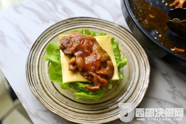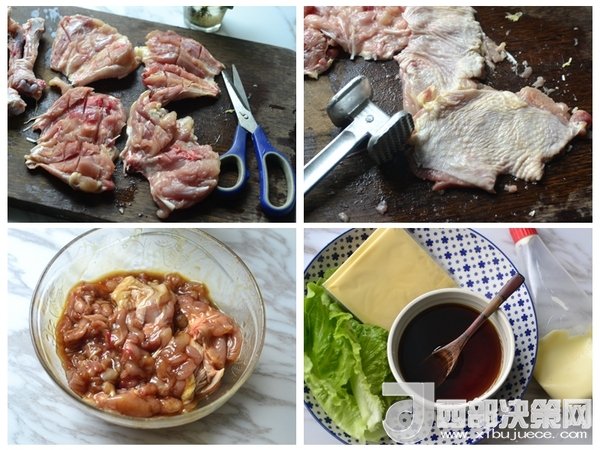 1、將冷卻好的面包胚從中間切開(kāi),然后放入生菜、芝士片、照燒雞腿和沙拉醬就好。