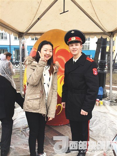 在俄羅斯的節(jié)日慶典活動(dòng)中,姜若晨(左一)與當(dāng)?shù)剀娦W(xué)生的合影。