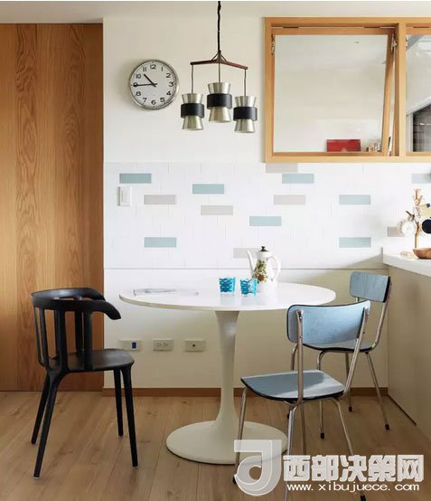 餐區(qū)裝飾十分簡(jiǎn)單,一張白色小圓桌,幾把藍(lán)色和黑色的餐椅,就成了房主人每天就餐的地方。