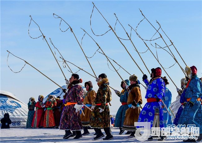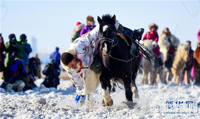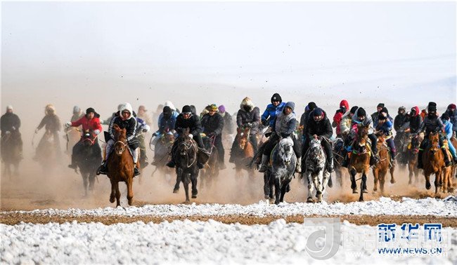 1月16日,在內(nèi)蒙古錫林浩特鳳凰馬場,當(dāng)?shù)啬撩癖硌萏遵R。