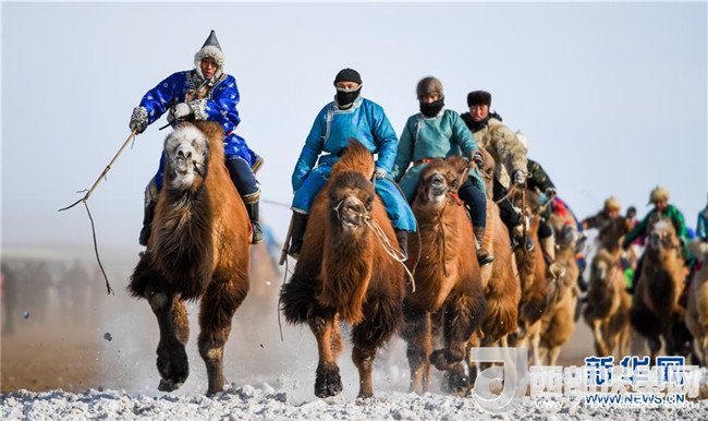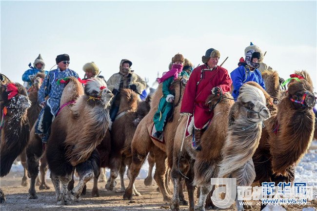 1月16日,在內(nèi)蒙古錫林浩特鳳凰馬場,當(dāng)?shù)貫跆m牧騎的演員們騎著駱駝進(jìn)入會場演出。