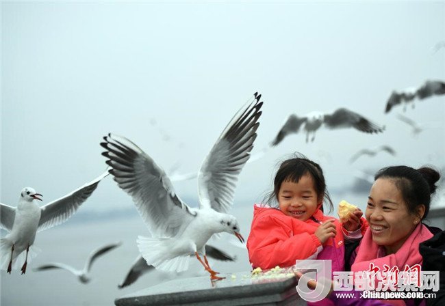 2月4日,一名女孩在昆明滇池邊給紅嘴鷗喂食。當(dāng)日,受較強冷空氣影響,“春城”昆明最低氣溫下降至-3℃。天氣雖然寒冷,卻抵擋不住市民和游客前來滇池觀賞、喂食越冬紅嘴鷗的熱情。中新社記者李進(jìn)紅攝