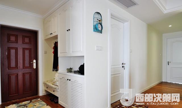 進(jìn)門玄關(guān),貼壁做了一排的櫥柜,模仿國外家居設(shè)計(jì),做了一個(gè)連體的矮柜換鞋凳,上方安裝掛鉤吊衣服。