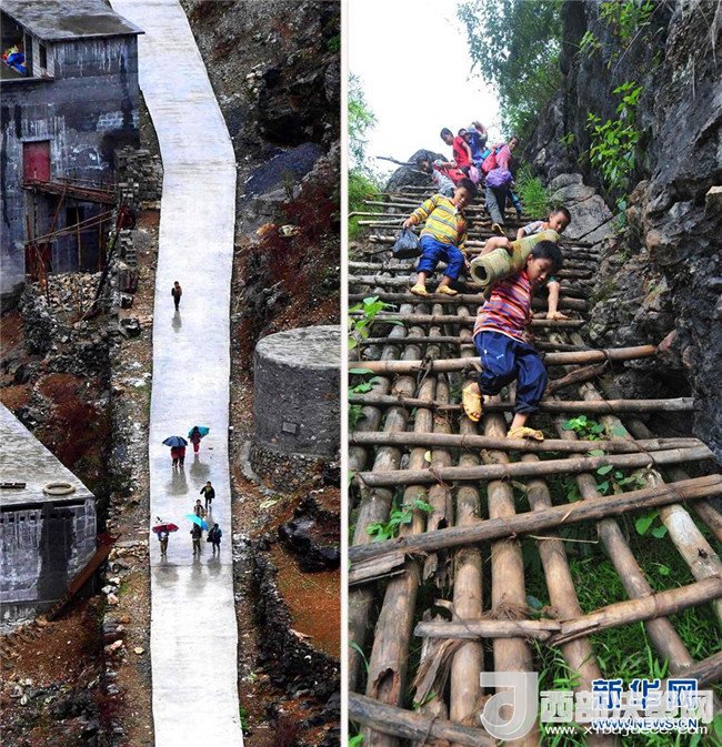 2012年9月3日,廣西大化瑤族自治縣板升鄉(xiāng)弄勇村弄頂屯的孩子們扛著生活用具去學(xué)校(右圖);2017年1月11日,水泥公路已經(jīng)從學(xué)校修通到家門口(左圖)。隨著脫貧攻堅(jiān)工作不斷推進(jìn),原本“千重山,萬(wàn)層嶺,不通水,不通電”的廣西大石山區(qū)發(fā)生了翻天覆地的變化。記者黃孝邦攝