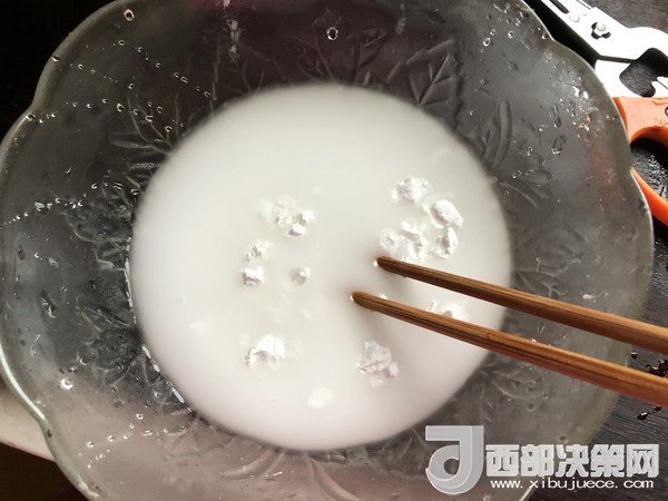 3.把土豆淀粉放入碗里,加入適量清水調勻后靜置30分鐘