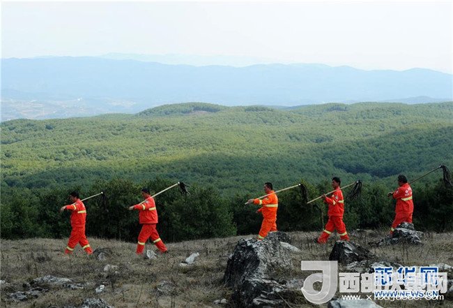 沙子坡林場(chǎng)的護(hù)林員在夕陽(yáng)下巡山歸來(2013年7月7日攝)。