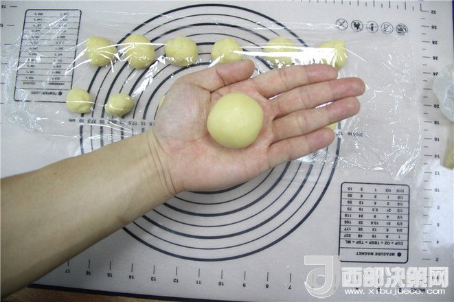 11.把油皮分割成6個(gè)25克,油心分成6個(gè)20克,分別揉成團(tuán)。