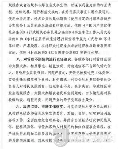 各級(jí)各部門對(duì)管轄范圍內(nèi)大操大辦、相互攀比、鋪張浪費(fèi)、封建迷信等不良風(fēng)氣聽(tīng)之任之,導(dǎo)致群眾反映強(qiáng)烈、問(wèn)題嚴(yán)重的,要依紀(jì)依規(guī)追究主體責(zé)任、監(jiān)督責(zé)任和相應(yīng)領(lǐng)導(dǎo)責(zé)任。村黨組織、村委會(huì)和村務(wù)監(jiān)督委員會(huì)負(fù)責(zé)人對(duì)村民說(shuō)服教育、勸阻制止不力,失職失責(zé),導(dǎo)致轄區(qū)內(nèi)發(fā)生違規(guī)操辦、大操大辦婚喪喜慶事宜問(wèn)題的,由鄉(xiāng)鎮(zhèn)紀(jì)委對(duì)其提醒約談、通報(bào)問(wèn)責(zé),問(wèn)題嚴(yán)重的給予黨紀(jì)政務(wù)處分。