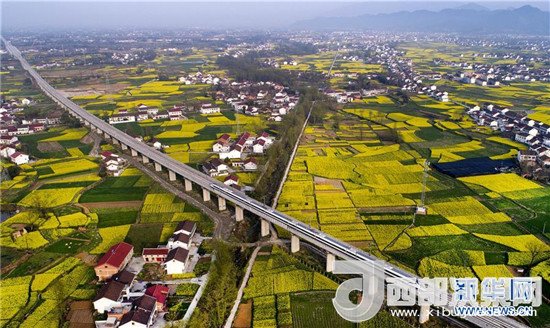 3月21日,一列動車正通過陜西省漢中市南鄭縣新集鎮(zhèn)油菜花海(無人機拍攝)。新華社記者 陶明 攝