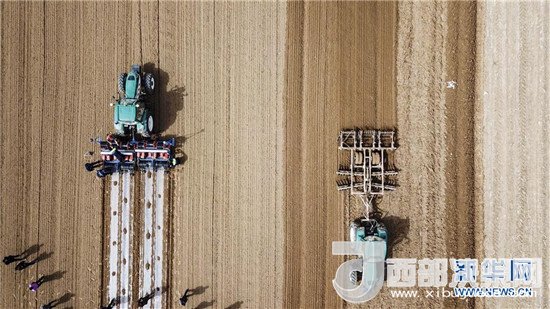 3月23日,“智能拖拉機”在新疆庫車縣牙哈鎮(zhèn)的一處棉田中進行精細化作業(yè)(無人機拍攝)。新華社記者 胡虎虎 攝
