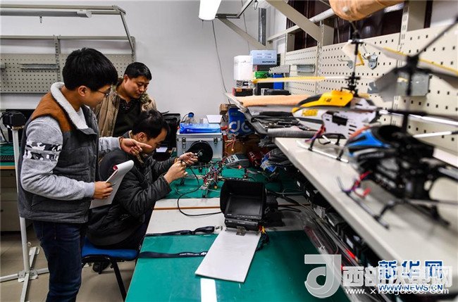 黃大年團(tuán)隊(duì)成員在實(shí)驗(yàn)室內(nèi)調(diào)試、組裝無(wú)人機(jī)(2017年2月9日攝)。