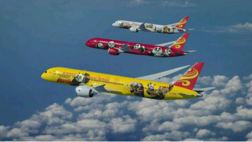 海南航空與夢工廠合作推出的三架“功夫熊貓”涂裝飛機翱翔藍天