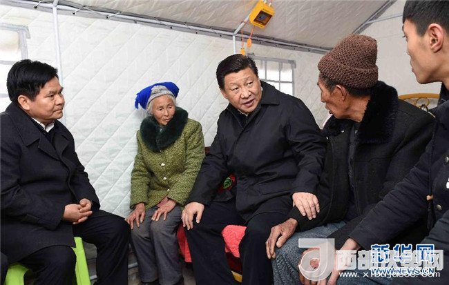 2015年1月19日至21日,中共中央總書記、國家主席、中央軍委主席習近平來到云南昭通、大理、昆明等地,看望魯?shù)榈卣馂膮^(qū)干部群眾,深入企業(yè)、工地、鄉(xiāng)村考察,就災后恢復重建和經(jīng)濟社會發(fā)展情況進行調(diào)研。這是1月19日,習近平來到魯?shù)榭h小寨鎮(zhèn)甘家寨紅旗社區(qū)過渡安置點,走進鄒體富老兩口和孫子住的帳篷,詢問家里吃飯、補助、收入等問題。新華社記者 張鐸 攝