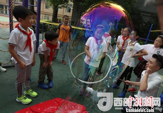 孩子們體驗被泡泡罩住的感受。 泱波 攝