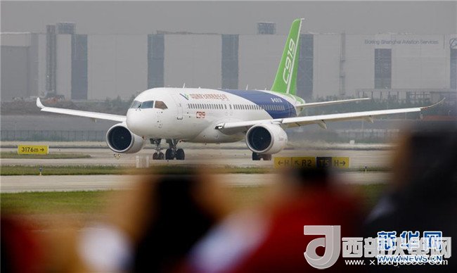 中國首款國際主流水準(zhǔn)的干線客機C919在上海浦東國際機場首飛成功(2017年5月5日攝)。新華社記者方喆攝