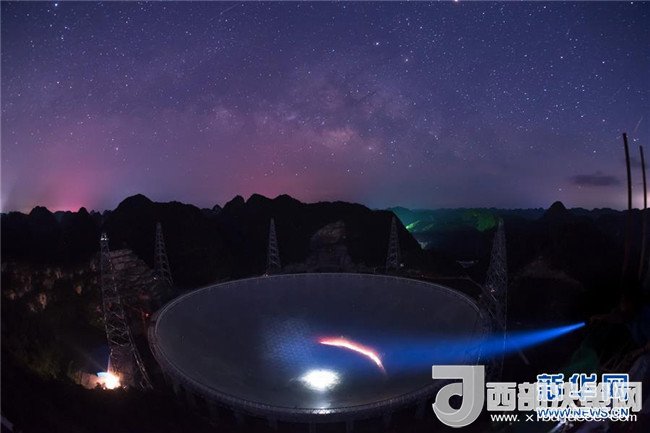 FAST在滿天繁星下呈現(xiàn)出的美麗景觀(2016年6月27日攝)。2017年10月10日,中國科學(xué)院國家天文臺宣布,被譽為“中國天眼”的500米口徑球面射電望遠鏡(FAST)經(jīng)過一年緊張調(diào)試,已實現(xiàn)指向、跟蹤、漂移掃描等多種觀測模式的順利運行,并確認了多顆新發(fā)現(xiàn)脈沖星。新華社記者劉續(xù)攝