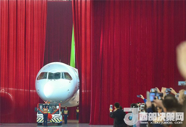 我國(guó)自主研制的C919大型客機(jī)首架機(jī),在中國(guó)商飛公司總裝制造中心浦東基地廠房?jī)?nèi)正式下線(2015年11月2日攝)。新華社發(fā)(裴鑫 攝)