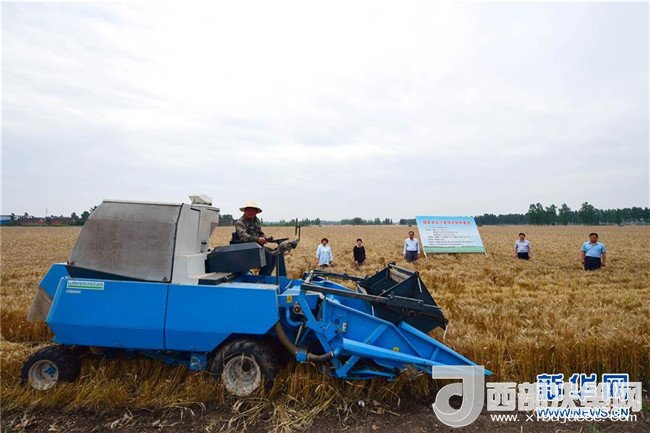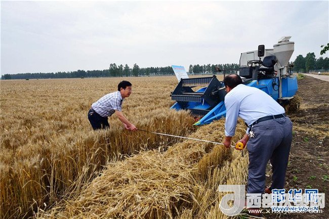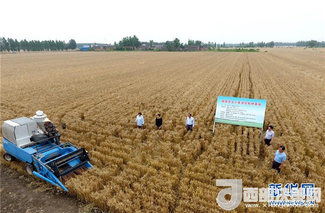 當(dāng)日,在河南省鄧州市腰店鎮(zhèn)國家雜交小麥項(xiàng)目制種基地,專家組對小麥進(jìn)行田間隨機(jī)多點(diǎn)取樣調(diào)查,收割機(jī)對小麥進(jìn)行實(shí)打?qū)嵤?。測產(chǎn)數(shù)據(jù)表明,雜交小麥種子生產(chǎn)在豐產(chǎn)性、抗逆性、抗病性、適應(yīng)性等方面表現(xiàn)優(yōu)異,標(biāo)志著我國雜交小麥研發(fā)進(jìn)入大田應(yīng)用和產(chǎn)業(yè)化階段。新華社記者 馮大鵬 攝