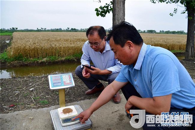 5月29日,在河南省鄧州市腰店鎮(zhèn)國家雜交小麥項(xiàng)目制種基地,工作人員將田間隨機(jī)多點(diǎn)取樣的小麥稱重。
