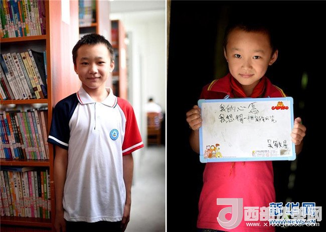 這是一張拼版圖片。左圖為2018年5月30日,在廣西三江侗族自治縣洋溪鄉(xiāng)中學,12歲的吳敏星在圖書館里留影;右圖為2014年5月26日,吳敏星在吊腳樓教室里展示他的“六一”心愿。