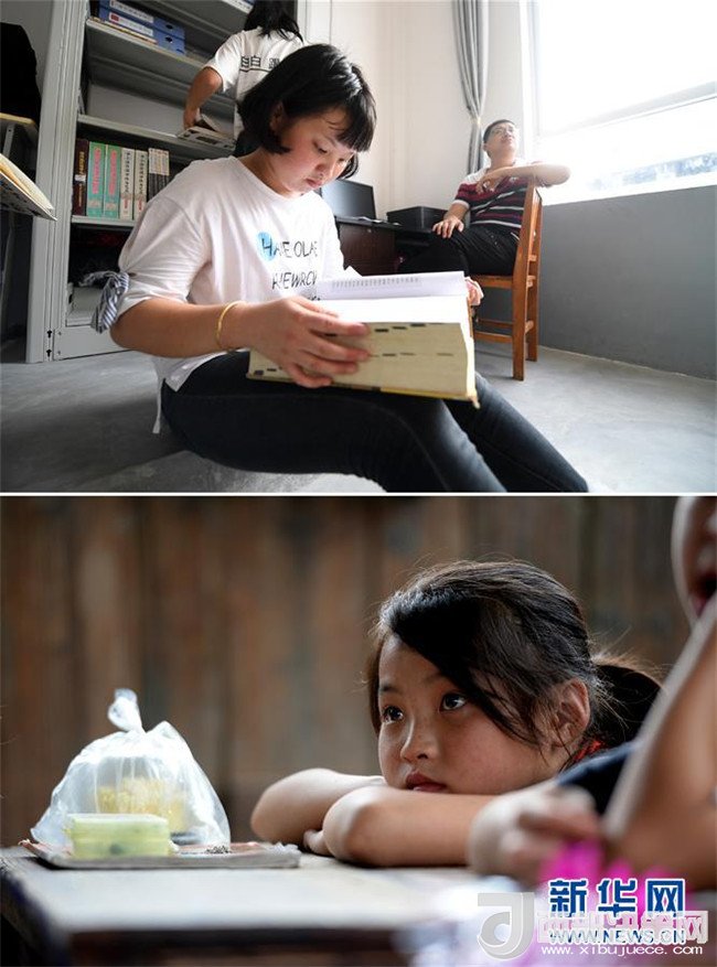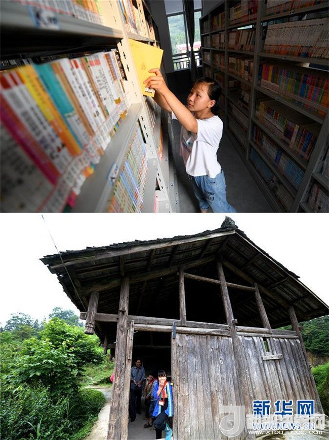 這是一張拼版圖片。上圖為2018年5月30日,在廣西三江侗族自治縣洋溪鄉(xiāng)中學,13歲的吳美新在圖書館里看書;下圖為2014年5月26日,吳美新站在吊腳樓教室門口張望。