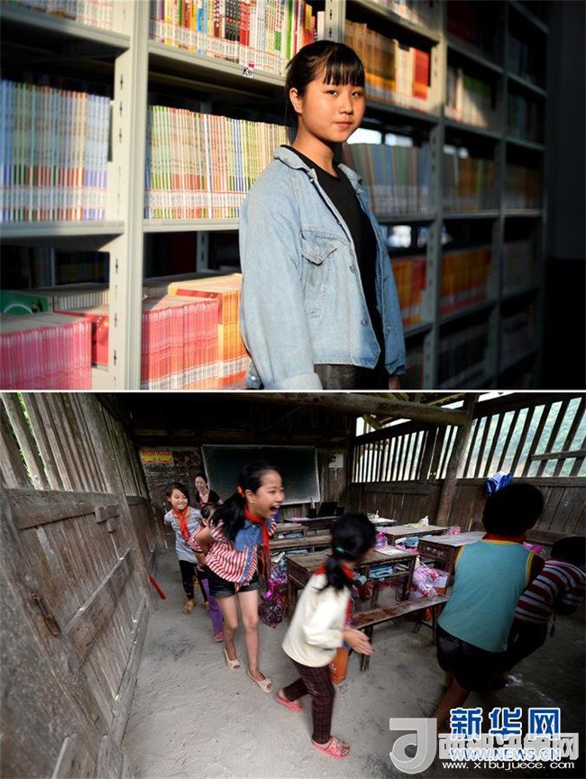 這是一張拼版圖片。上圖為2018年5月30日,在廣西三江侗族自治縣洋溪鄉(xiāng)中學,14歲的吳瑩瑩在圖書館里留影;下圖為2014年6月10日,吳瑩瑩(前三)和同學們在吊腳樓教室里做游戲。