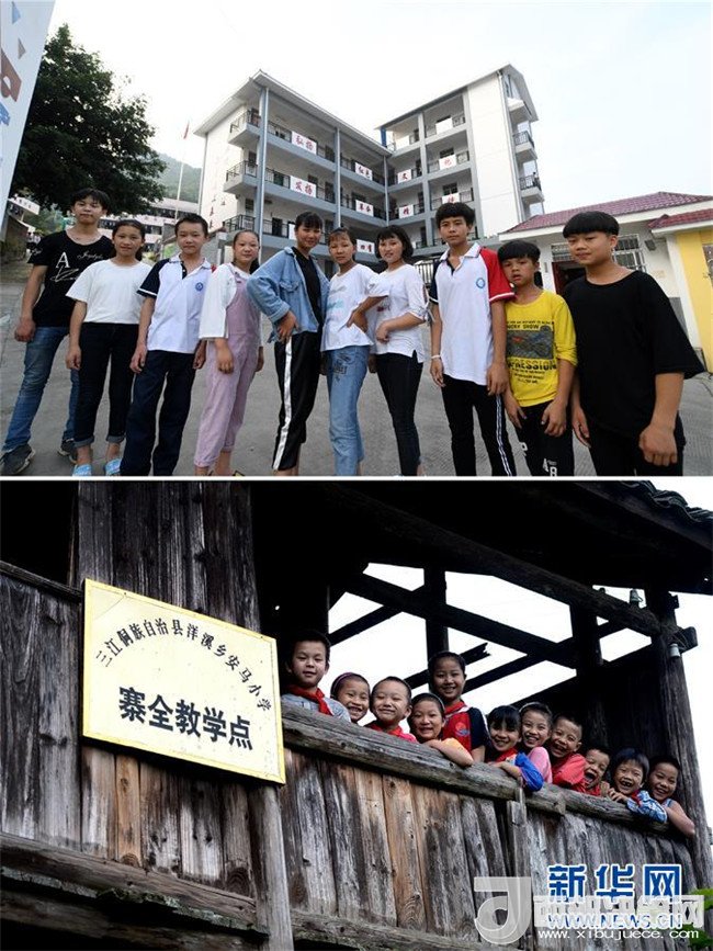 這是一張拼版圖片。上圖為2018年5月30日,在廣西三江侗族自治縣洋溪鄉(xiāng)中學,已經(jīng)進入初一就讀的孩子們在校園里合影;下圖為2014年5月26日,孩子們在寨全教學點的吊腳樓教室上留影。