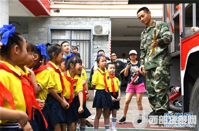 當(dāng)日,數(shù)十名來自廣西南寧市濱湖路小學(xué)的孩子們和家長一起走進(jìn)青秀區(qū)公安消防大隊柳沙中隊,參加消防疏散演習(xí)、參觀消防車、了解消防設(shè)備設(shè)施用途,在親子活動中學(xué)習(xí)消防知識。新華社記者 周華 攝
