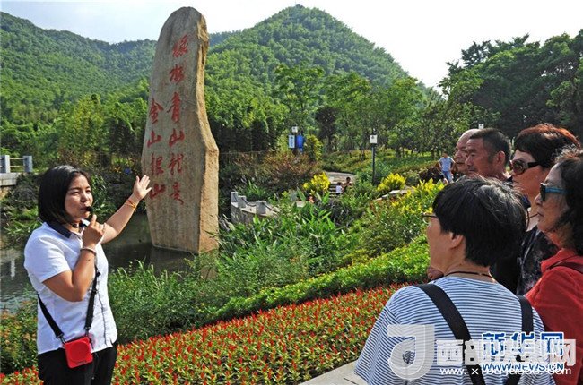 6月3日,安吉縣余村農(nóng)家女導(dǎo)游潘春連(左一)向游客介紹當?shù)?ldquo;美麗鄉(xiāng)村”景色。新華社記者 譚進 攝
