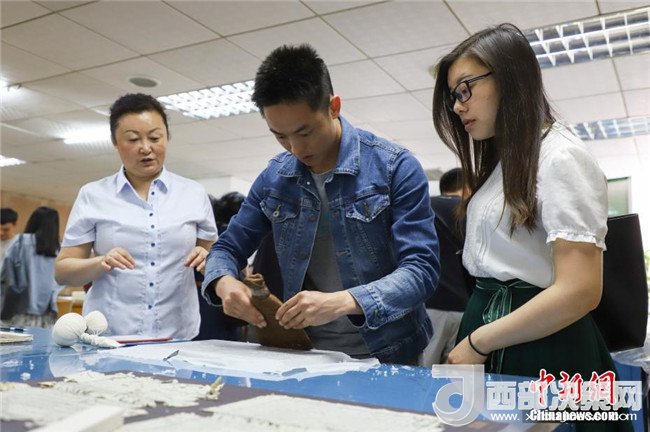 一位同學(xué)在修復(fù)師的指導(dǎo)下體驗。中新社發(fā)瞿宏倫攝