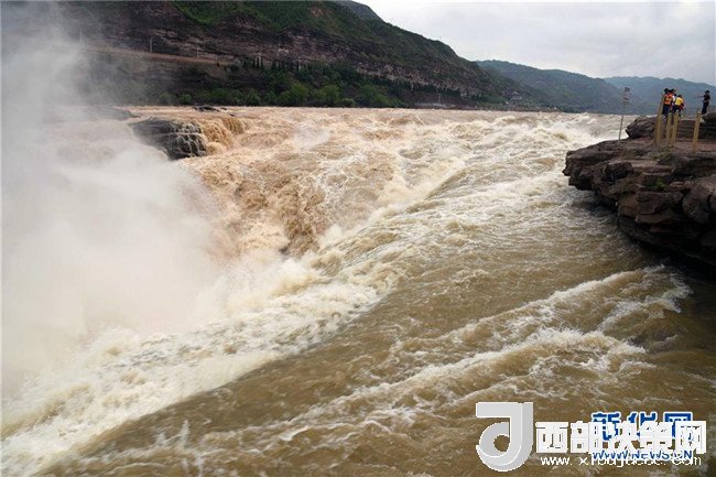 6月26日,游客在欣賞黃河壺口瀑布半清半濁景觀。