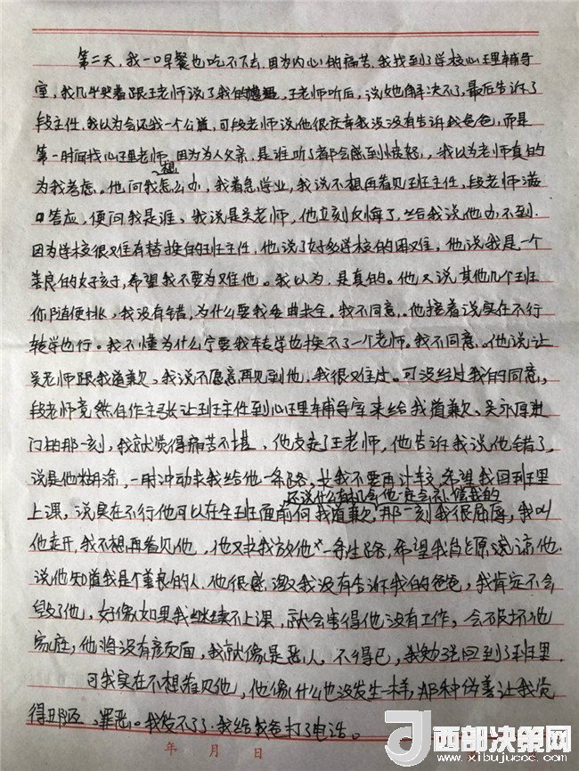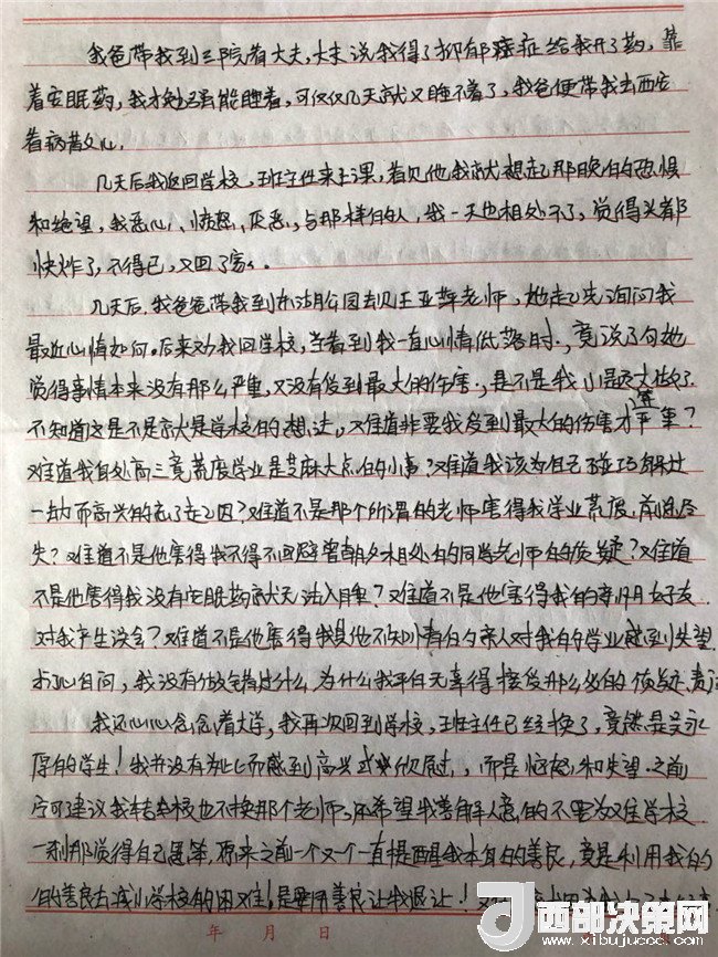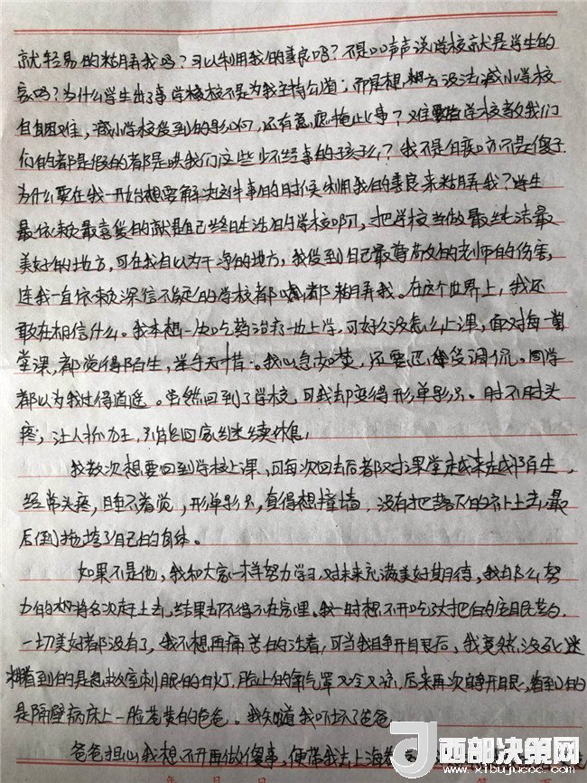 孩子的病情一直不見好轉(zhuǎn),主治醫(yī)生和心理輔導(dǎo)老師都說要打開孩子的心結(jié),而孩子的心結(jié)就在學(xué)校一直沒有給她一個公正的說法。在斷斷續(xù)續(xù)上學(xué)過程中,他多次找過學(xué)校。起初學(xué)校還和他談,后來學(xué)校說他們是組織教學(xué)的地方,處理教師的事管不了,要找教育局,直接就不理他了。再后來他連門都進不去了。