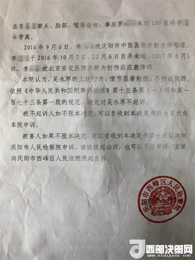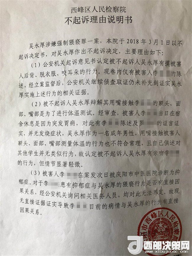 2017年2月26日,李某奕在父親陪同下到公安機關(guān)報案,稱被其班主任吳某厚猥褻,要求查處。經(jīng)辦案部門調(diào)查,2017年5月2日,公安機關(guān)依據(jù)《中華人民共和國治安管理處罰法》第四十四條之規(guī)定,以猥褻行為對吳某厚處以行政拘留十日處罰。其間,李某奕父親認(rèn)為公安局處罰不當(dāng),到西峰區(qū)人民檢察院進行申訴。區(qū)檢察院調(diào)閱案卷后認(rèn)為吳某厚的行為涉嫌犯罪,書面通知公安局立案偵查。公安局于2017年8月10日立為刑事案件。8月25日對吳某厚采取取保候?qū)彺胧?1月20日偵查終結(jié)后移送起訴至區(qū)檢察院。區(qū)檢察院審查后認(rèn)為吳某厚的行為“情節(jié)顯著輕微,不構(gòu)成犯罪”,“決定對吳某厚不起訴”,并出具《不起訴理由說明書》。提出不起訴的三個理由,包括“公安機關(guān)繼續(xù)偵查取證仍未補充到吳某厚實施上述行為的相關(guān)證據(jù)”、“吳某厚有親吻李某奕的行為,但情節(jié)顯著輕微”、“無直接證據(jù)證實導(dǎo)致李某奕目前的病情與吳某厚的行為有直接因果關(guān)系”,于2018年3月1日作出不起訴決定。李某奕遂到慶陽市人民檢察院進行申訴。5月18日,市檢察院維持區(qū)檢察院不起訴決定。6月25日晚,據(jù)李某奕父親講,他已將申訴材料寄至甘肅省人民檢察院。